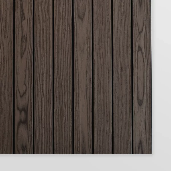 Oplev raffinement med ThinRibbon Cottage Oak, en lamelvæg med polerede egefinerlameller i røget rustik stil, elegant monteret på vores akustiske filt, RecoSilent.